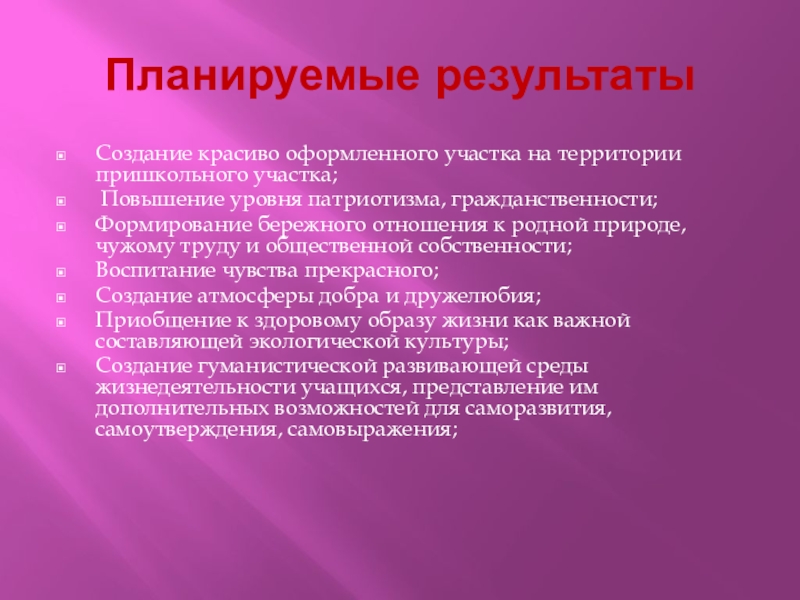 Создание красиво оформленного участка на территории пришкольного участка;