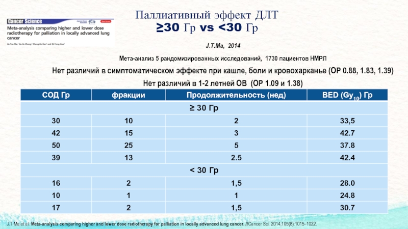 J.T.Ma et al. Meta-analysis comparing higher and lower dose radiotherapy for palliation in locally advanced lung cancer. //Cancer Sci. 2014,105(8):1015–1022.