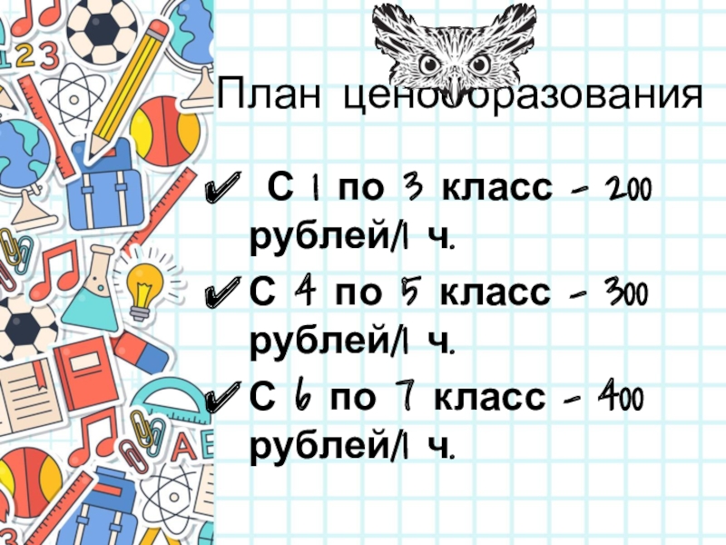 План ценообразования С 1 по 3 класс – 200 рублей/1 ч.С 4 по 5 класс – 300