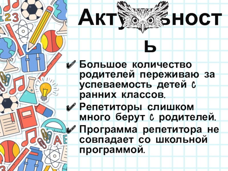 АктуальностьБольшое количество родителей переживаю за успеваемость детей c ранних классов.Репетиторы слишком много берут c родителей.Программа репетитора не