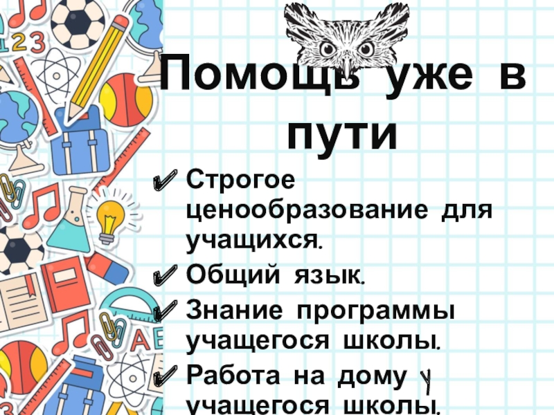 Помощь уже в путиСтрогое ценообразование для учащихся.Общий язык.Знание программы учащегося школы.Работа на дому y учащегося школы.