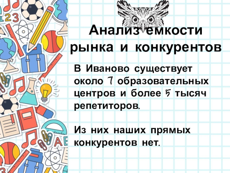 Анализ ёмкости рынка и конкурентовВ Иваново существует около 7 образовательных центров и более 5 тысяч репетиторов.