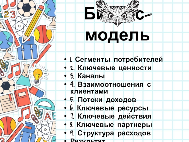 Бизнес-модель1. Сегменты потребителей2. Ключевые ценности3. Каналы4. Взаимоотношения с клиентами5. Потоки доходов6. Ключевые ресурсы7. Ключевые действия8. Ключевые партнеры9.