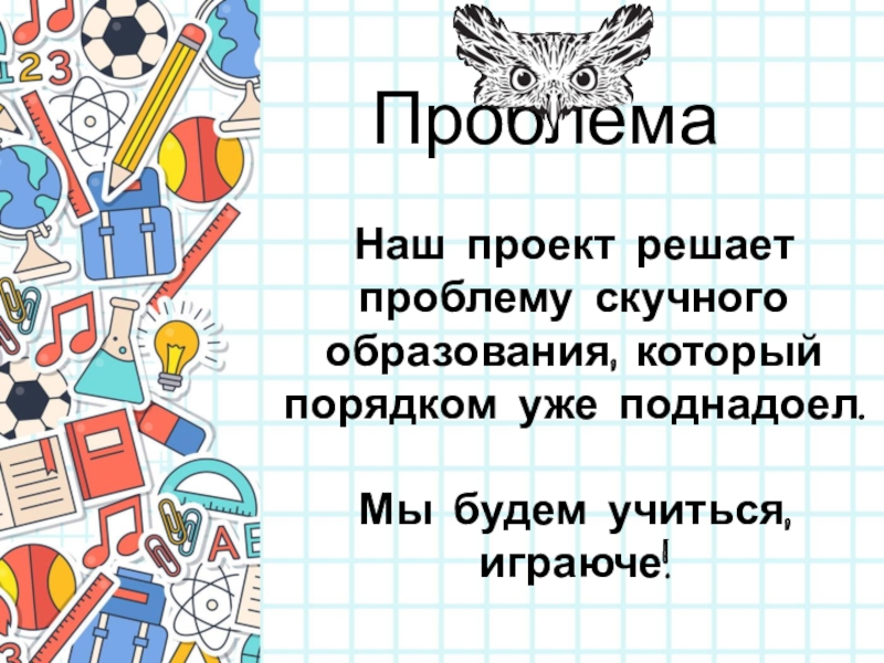 ПроблемаНаш проект решает проблему скучного образования, который порядком уже поднадоел.   Мы будем учиться, играюче!