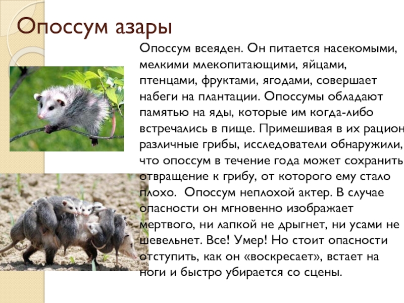 фруктами, ягодами, совершает набеги на плантации. Опоссумы обладают памятью на