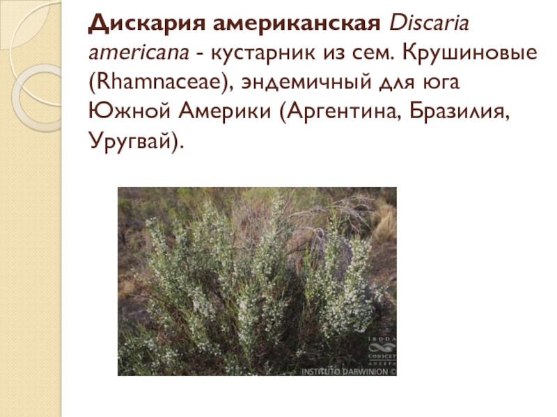 Слайд 15Дискария американская Discaria americanа - кустарник из сем. Крушиновые (Rhamnaceae), эндемичный для