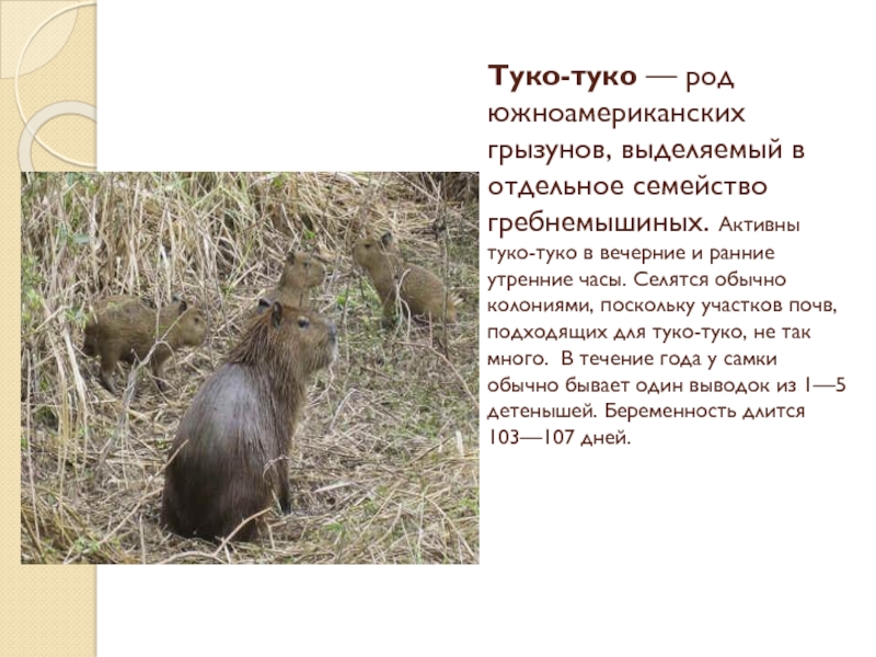 Слайд 32Туко-туко — род южноамериканских грызунов, выделяемый в отдельное семейство гребнемышиных.