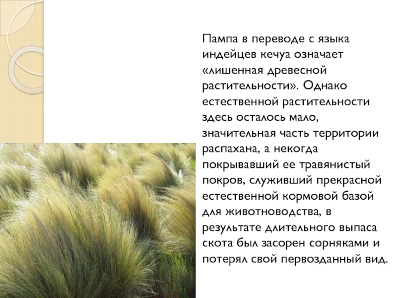 Слайд 6Пампа в переводе с языка индейцев кечуа означает «лишенная древесной