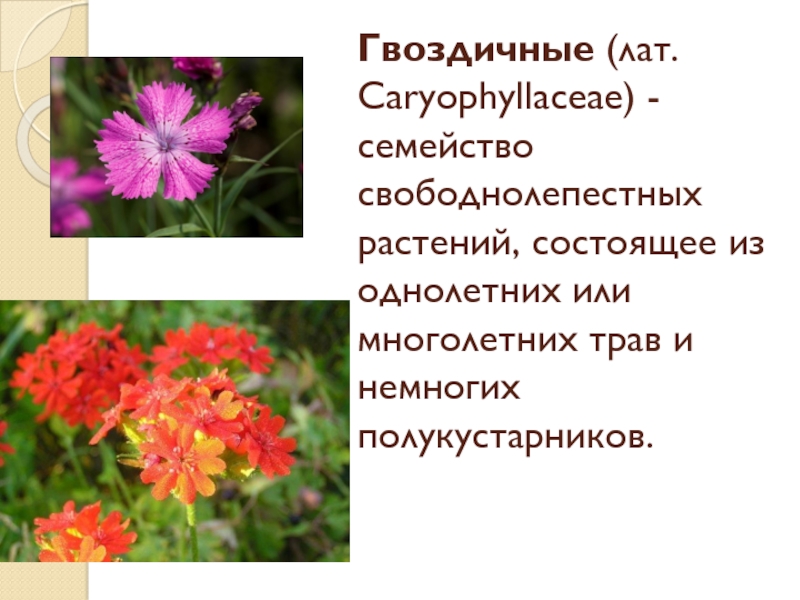 Слайд 26Гвоздичные (лат. Caryophyllaceae) - семейство свободнолепестных растений, состоящее из однолетних