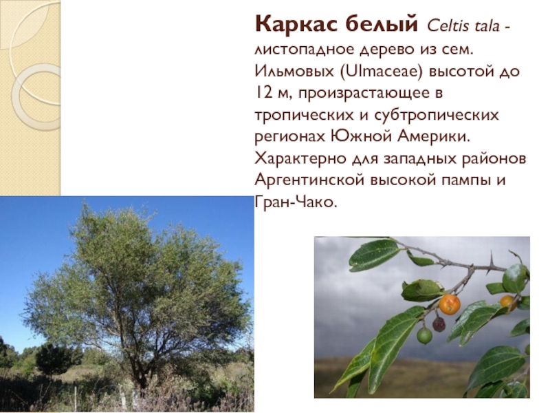Слайд 13Каркас белый Celtis tala - листопадное дерево из сем. Ильмовых (Ulmaceae) высотой