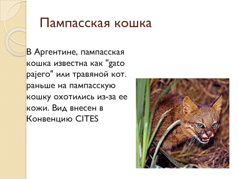 травяной кот. раньше на пампасскую кошку охотились из-за ее кожи.