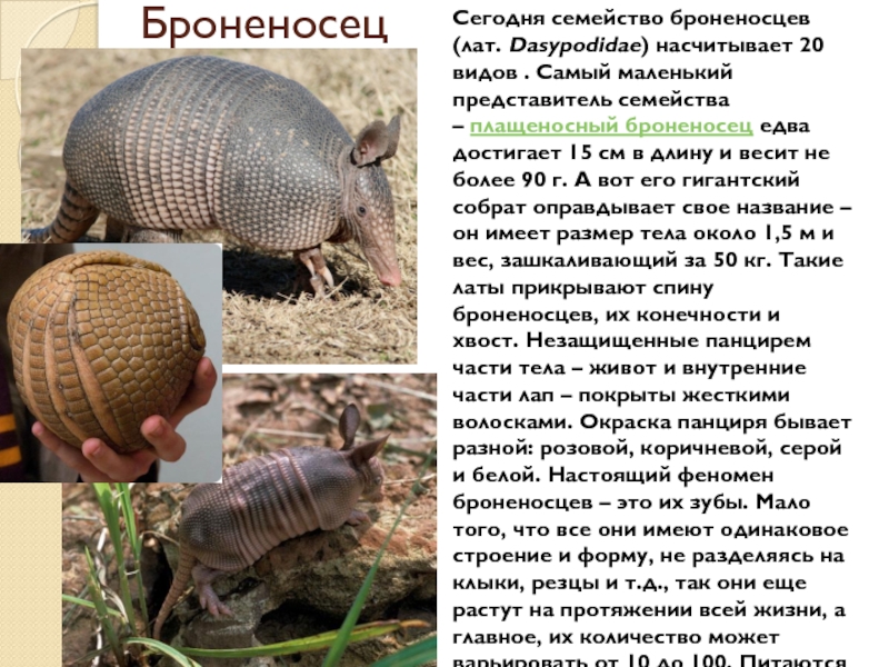 Сегодня семейство броненосцев (лат. Dasypodidae) насчитывает 20 видов . Самый маленький