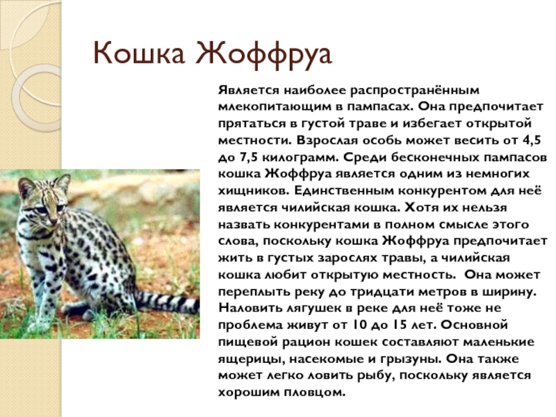 весить от 4,5 до 7,5 килограмм. Среди бесконечных пампасов кошка Жоффруа является одним из немногих хищников. Единственным конкурентом для неё является чилийская кошка. Хотя их нельзя назвать конкурентами в полном смысле этого слова, поскольку кошка Жоффруа предпочитает жить в густых зарослях травы, а чилийская кошка любит открытую местность. Она может переплыть реку до тридцати метров в ширину. Наловить лягушек в реке для неё тоже не проблема живут от 10 до 15 лет. Основной пищевой рацион кошек составляют маленькие ящерицы, насекомые и грызуны. Она также может легко ловить рыбу, поскольку является хорошим пловцом.