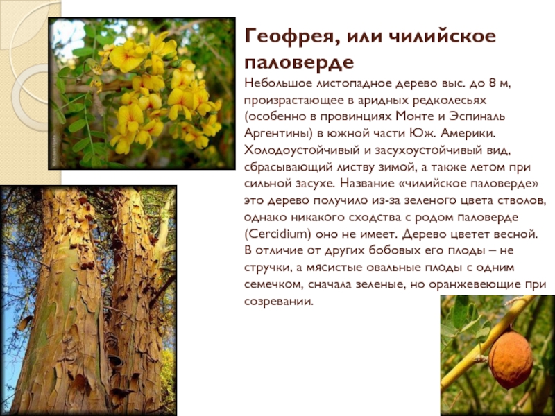 Эспиналь Аргентины) в южной части Юж. Америки. Холодоустойчивый и засухоустойчивый вид, сбрасывающий листву зимой, а также летом при сильной засухе. Название «чилийское паловерде» это дерево получило из-за зеленого цвета стволов, однако никакого сходства с родом паловерде (Cercidium) оно не имеет. Дерево цветет весной. В отличие от других бобовых его плоды – не стручки, а мясистые овальные плоды с одним семечком, сначала зеленые, но оранжевеющие при созревании.
