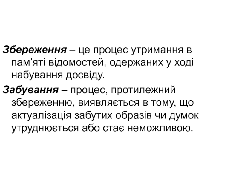 Слайд 13Збереження – це процес утримання в пам’яті відомостей, одержаних у