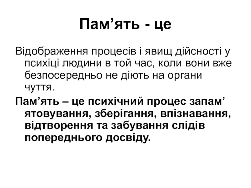 Пам’ять – це психічний процес запам’ятовування, зберігання, впізнавання, відтворення та забування слідів попереднього досвіду.