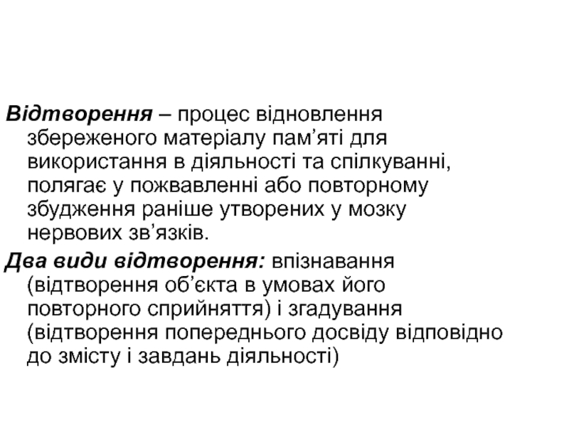 Слайд 14Відтворення – процес відновлення збереженого матеріалу пам’яті для використання в