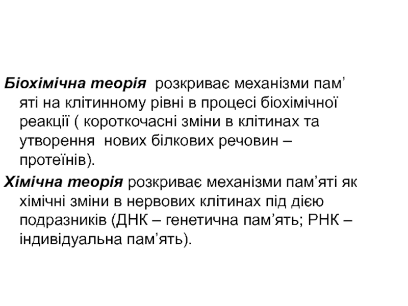 Слайд 10Біохімічна теорія розкриває механізми пам’яті на клітинному рівні в процесі