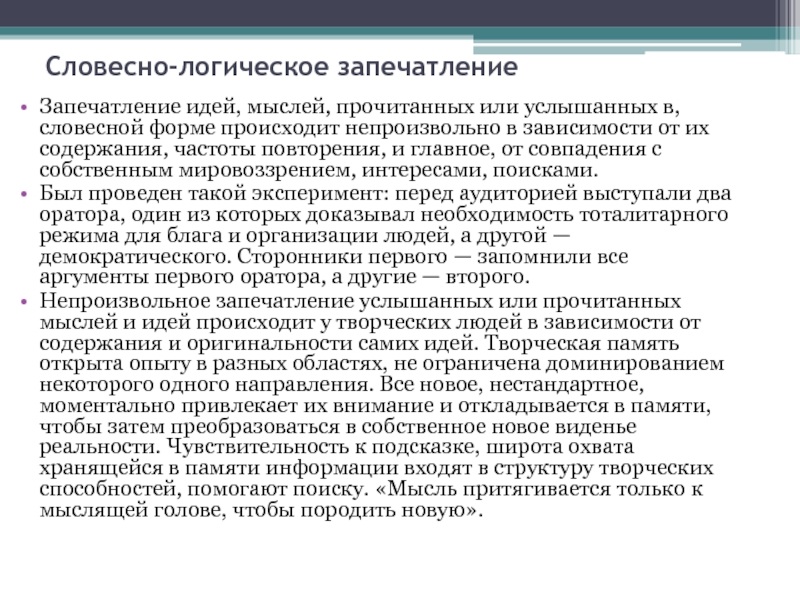 Непроизвольное запечатление услышанных или прочитанных мыслей и идей происходит у творческих людей в зависимости от содержания и оригинальности самих идей. Творческая память открыта опыту в разных областях, не ограничена доминированием некоторого одного направления. Все новое, нестандартное, моментально привлекает их внимание и откладывается в памяти, чтобы затем преобразоваться в собственное новое виденье реальности. Чувствительность к подсказке, широта охвата хранящейся в памяти информации входят в структуру творческих способностей, помогают поиску. «Мысль притягивается только к мыслящей голове, чтобы породить новую».