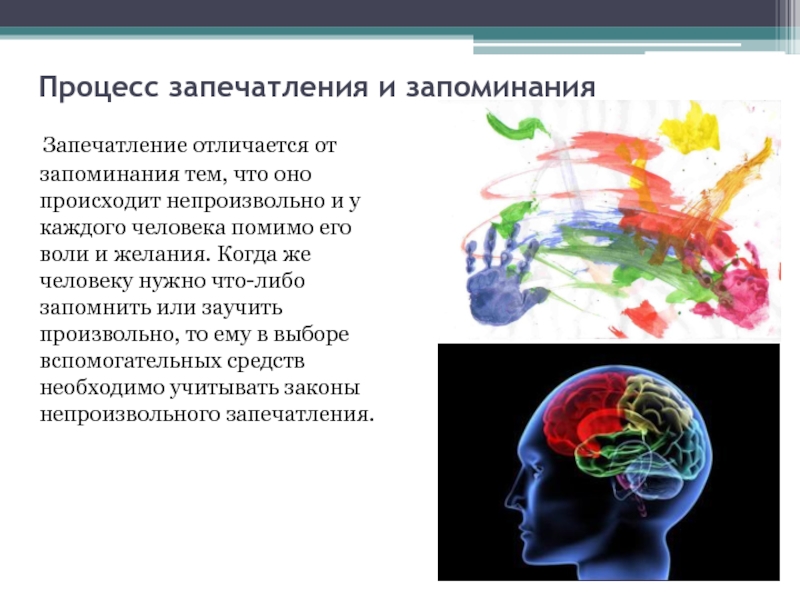 воли и желания. Когда же человеку нужно что-либо запомнить или заучить произвольно, то ему в выборе вспомогательных средств необходимо учитывать законы непроизвольного запечатления.
