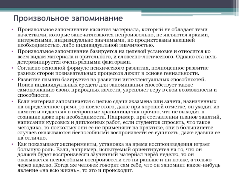 Произвольное запоминание базируется на целевой установке и относится ко всем видам материала и зрительного, и словесно-логического. Однако эта цель детерминируется очень разными факторами.