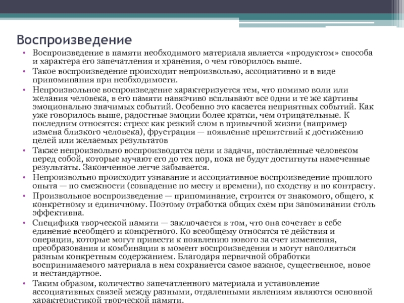 Произвольное воспроизведение — припоминание, строится от знакомого, общего, к конкретному и единичному. Поэтому отработка общих схем при запоминании столь эффективна.
