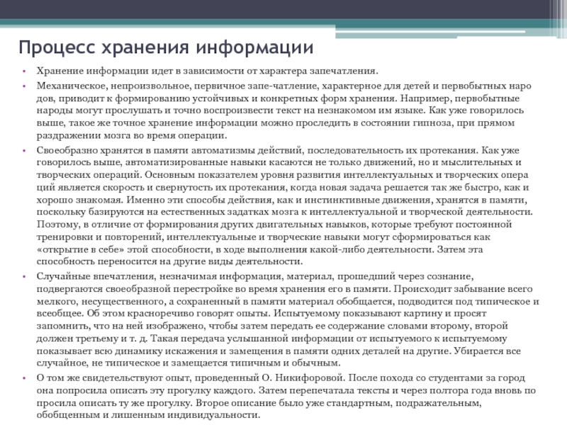 к формированию устойчивых и конкретных форм хранения. Например, первобытные народы могут прослушать и точно воспроизвести текст на незнакомом им языке. Как уже говорилось выше, такое же точное хранение информации можно проследить в состоянии гипноза, при прямом раздражении мозга во время операции.