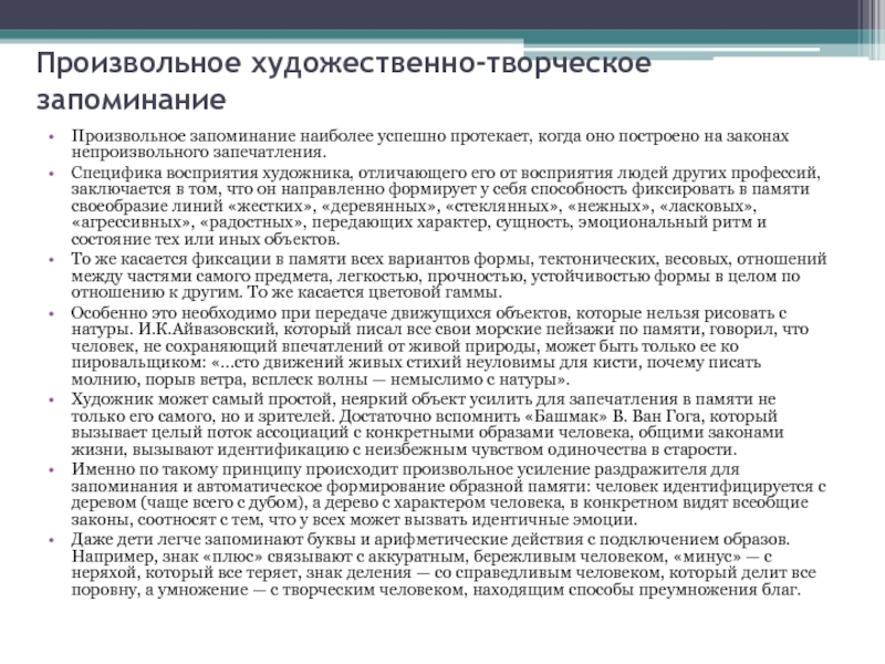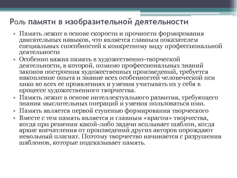 Особенно важна память в художественно-творческой деятельности, в которой, помимо профессиональных знаний законов построения художественных произведений, требуется накопление опыта и знание всех особенностей человеческой психики во всех ее проявлениях и умения учитывать их у себя в процессе художественного творчества.