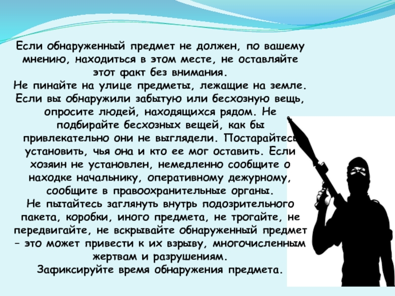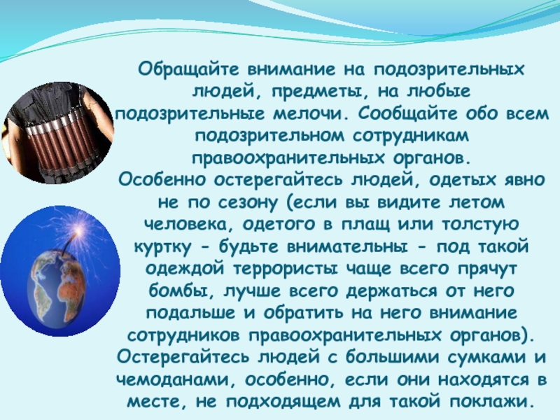 Слайд 3Обращайте внимание на подозрительных людей, предметы, на любые подозрительные мелочи.