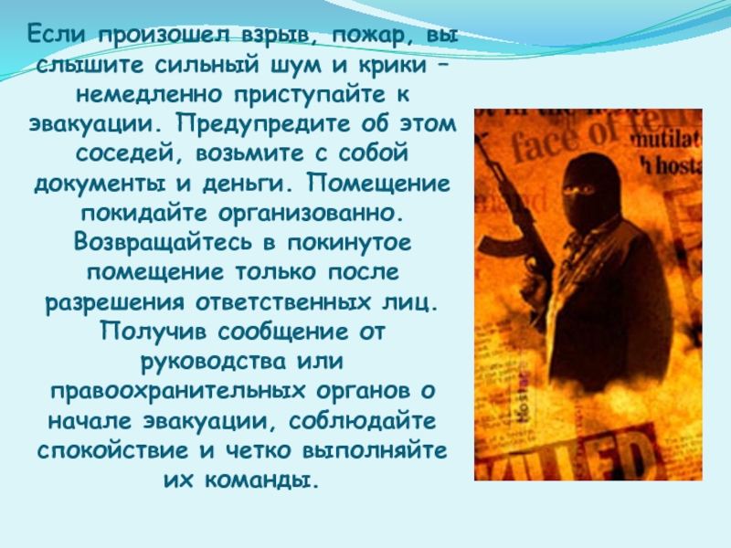 Слайд 4Если произошел взрыв, пожар, вы слышите сильный шум и крики