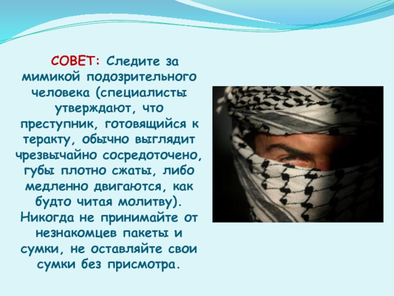 сжаты, либо медленно двигаются, как будто читая молитву). Никогда не принимайте от незнакомцев пакеты и сумки, не оставляйте свои сумки без присмотра.