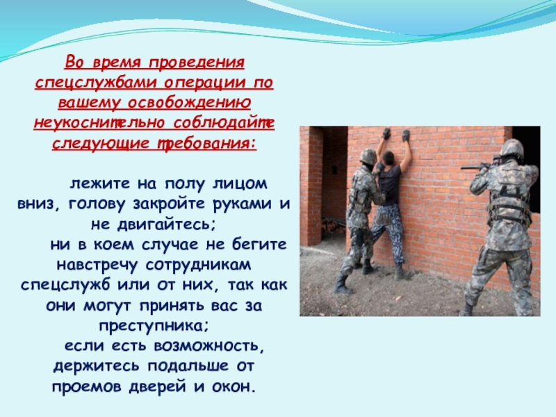 Слайд 13Во время проведения спецслужбами операции по вашему освобождению неукоснительно соблюдайте