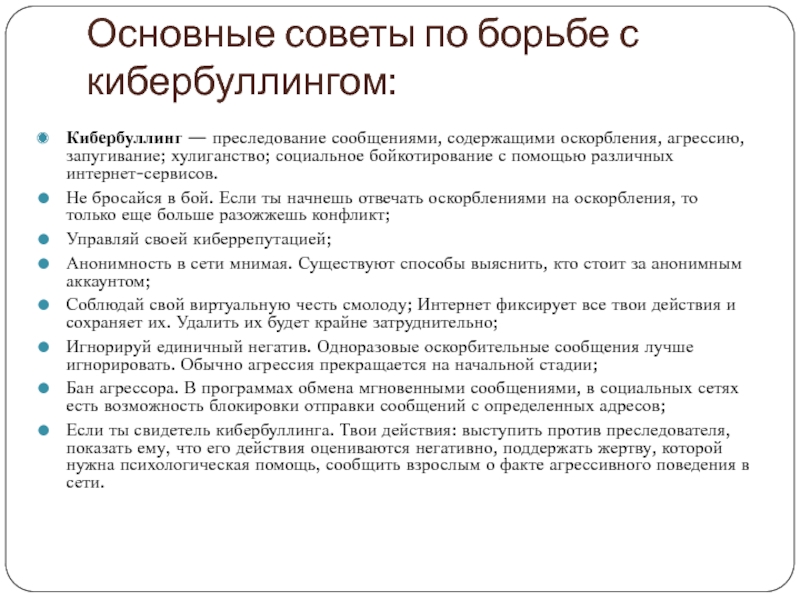 Слайд 9Основные советы по борьбе с кибербуллингом:
