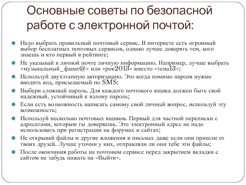 Слайд 8Основные советы по безопасной работе с электронной почтой: