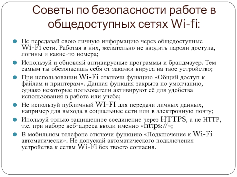 Слайд 5Советы по безопасности работе в общедоступных сетях Wi-fi: