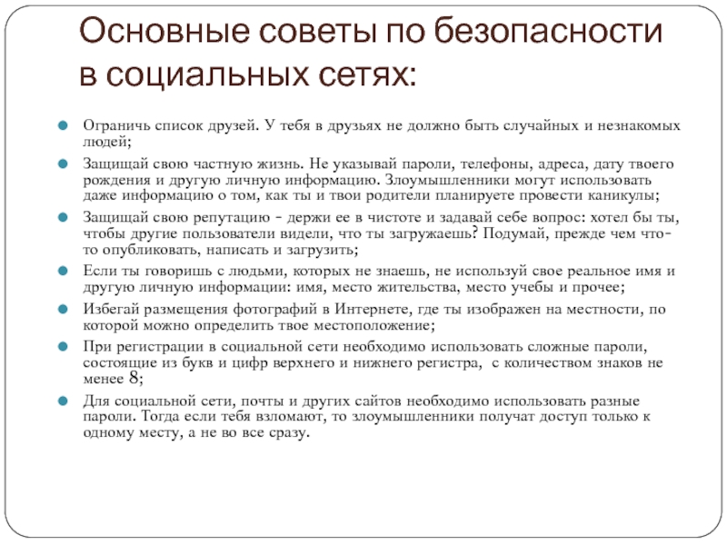 Слайд 6Основные советы по безопасности в социальных сетях: