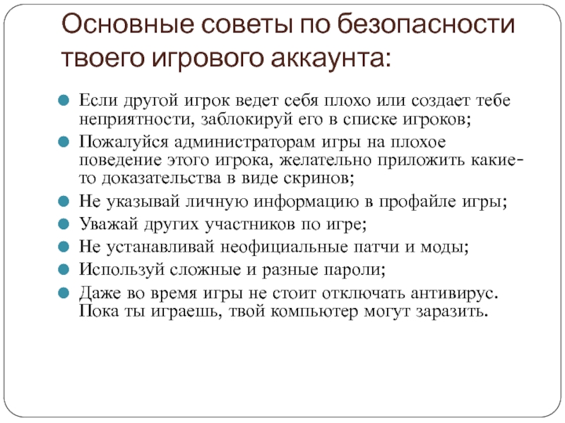 Слайд 11Основные советы по безопасности твоего игрового аккаунта: