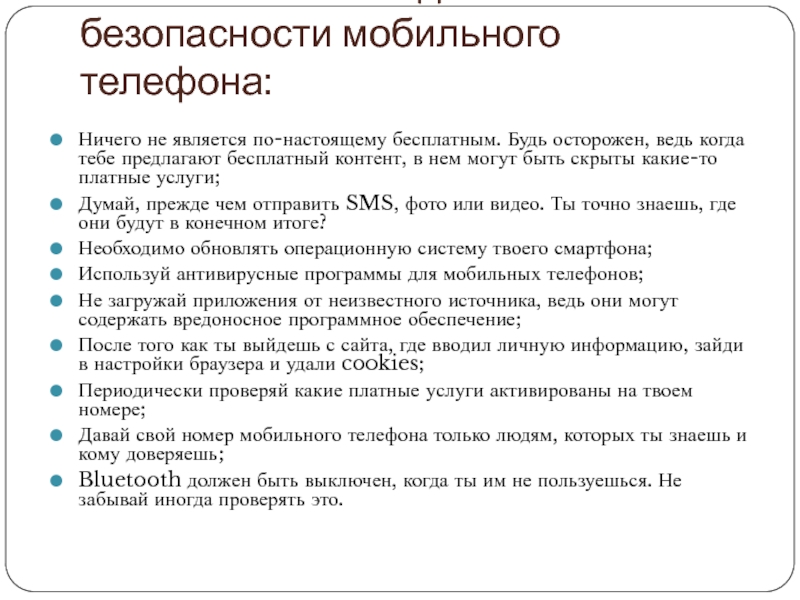 Слайд 10Основные советы для безопасности мобильного телефона: