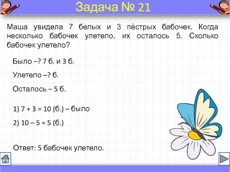 Было –? 7 б. и 3 б.Улетело –? б. Осталось – 5 б.Маша увидела 7 белых и