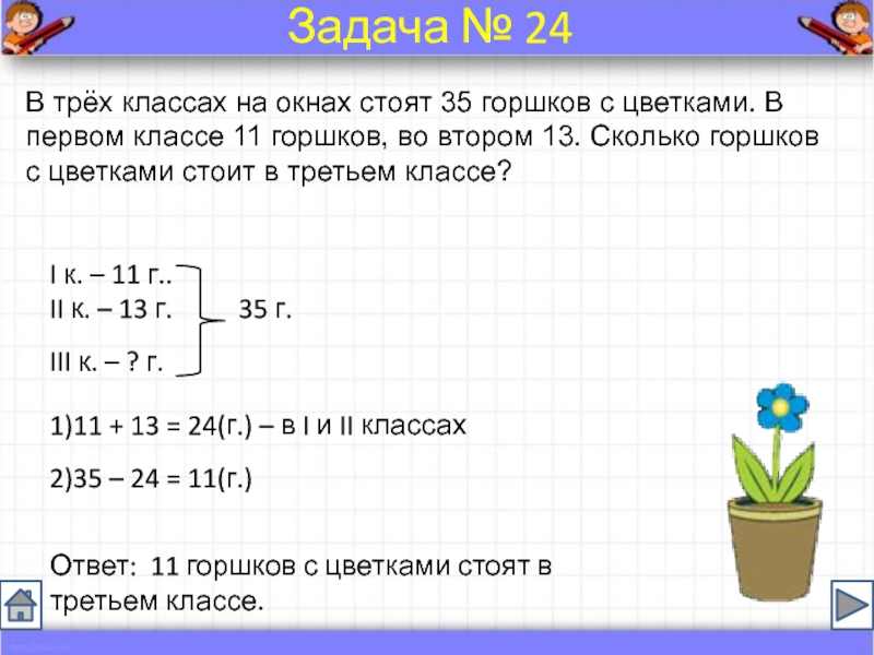 Слайд 18В трёх классах на окнах стоят 35 горшков с цветками.