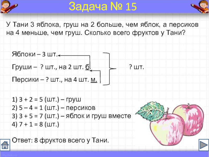 Яблоки – 3 шт. Груши – ? шт., на 2 шт. б. ? шт. Персики – ? шт., на 4 шт. м.