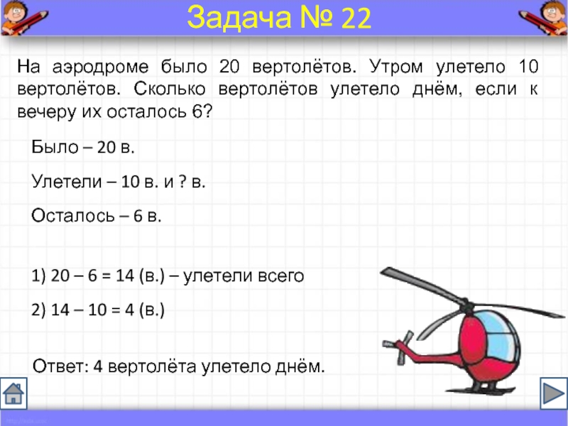 вертолётов. Сколько вертолётов улетело днём, если к вечеру их осталось 6?
