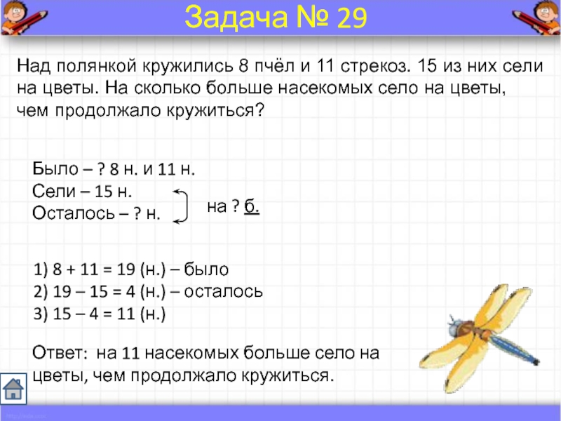 Слайд 23Над полянкой кружились 8 пчёл и 11 стрекоз. 15 из