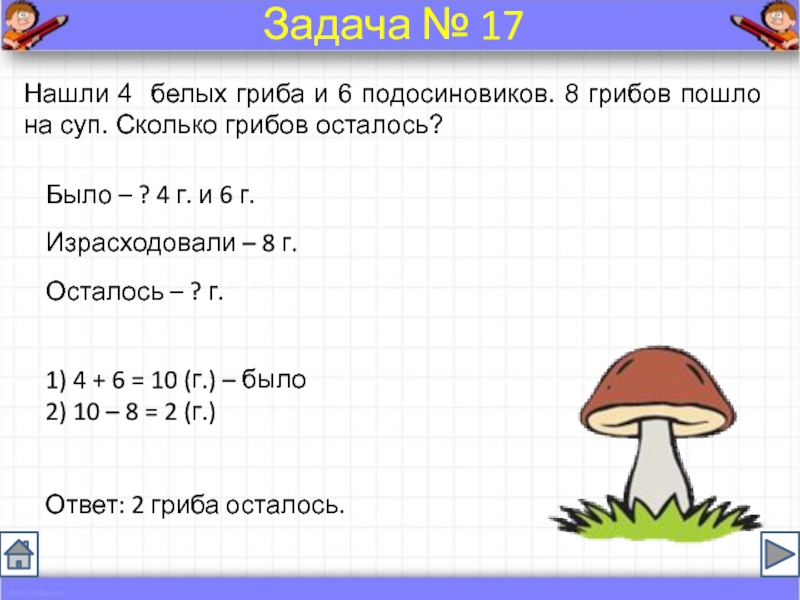 Дед Мазай вёз на своей лодке 5 зайцев. Он подобрал ещё несколько зайцев, и их стало 8. Сколько зайцев подобрал дед Мазай? Было – 5 з.Подобрал – ? з. Стало –