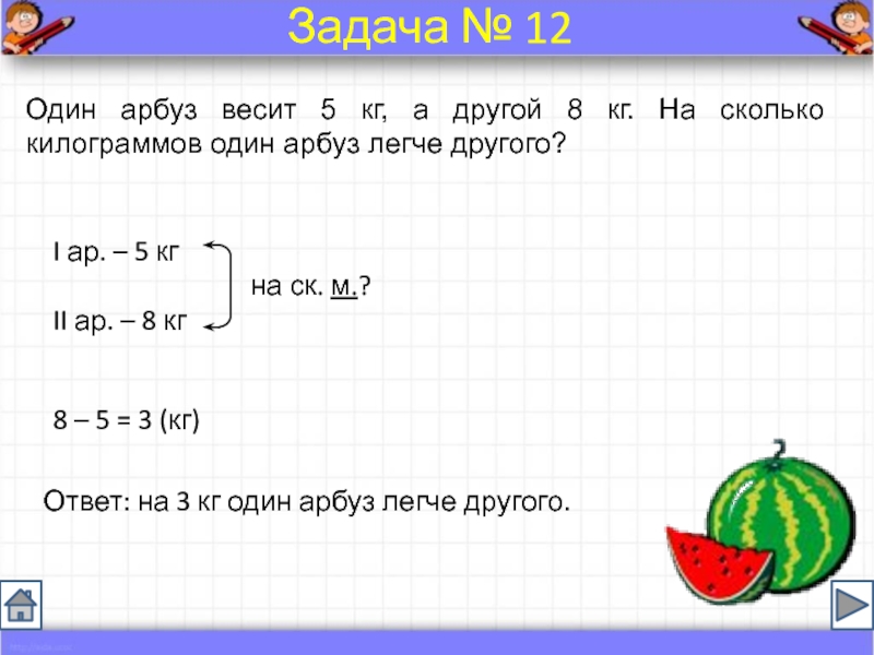 Слайд 6Один арбуз весит 5 кг, а другой 8 кг. На