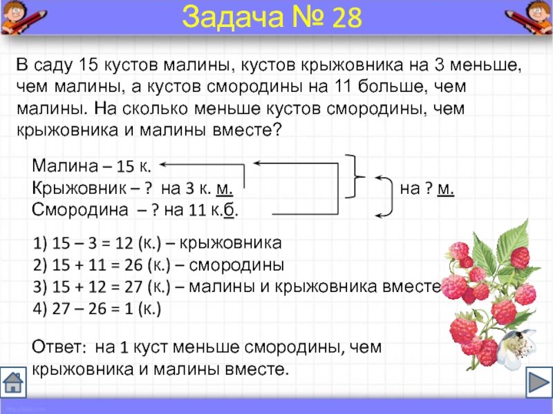 Слайд 22В саду 15 кустов малины, кустов крыжовника на 3 меньше,