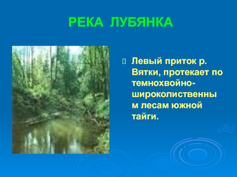 РЕКА ЛУБЯНКАЛевый приток р.Вятки, протекает по темнохвойно-широколиственным лесам южной тайги.