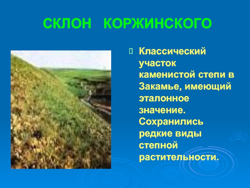 СКЛОН  КОРЖИНСКОГОКлассический участок каменистой степи в Закамье, имеющий эталонное значение. Сохранились редкие виды степной растительности.