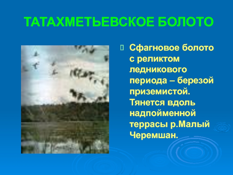 ТАТАХМЕТЬЕВСКОЕ БОЛОТОСфагновое болото с реликтом ледникового периода – березой приземистой. Тянется вдоль надпойменной террасы р.Малый Черемшан.