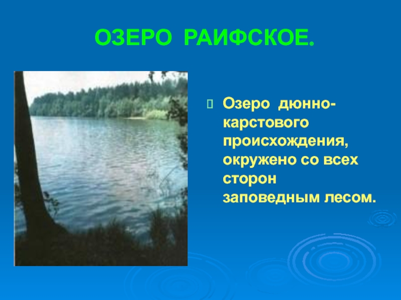 ОЗЕРО РАИФСКОЕ.Озеро дюнно-карстового происхождения, окружено со всех сторон заповедным лесом.